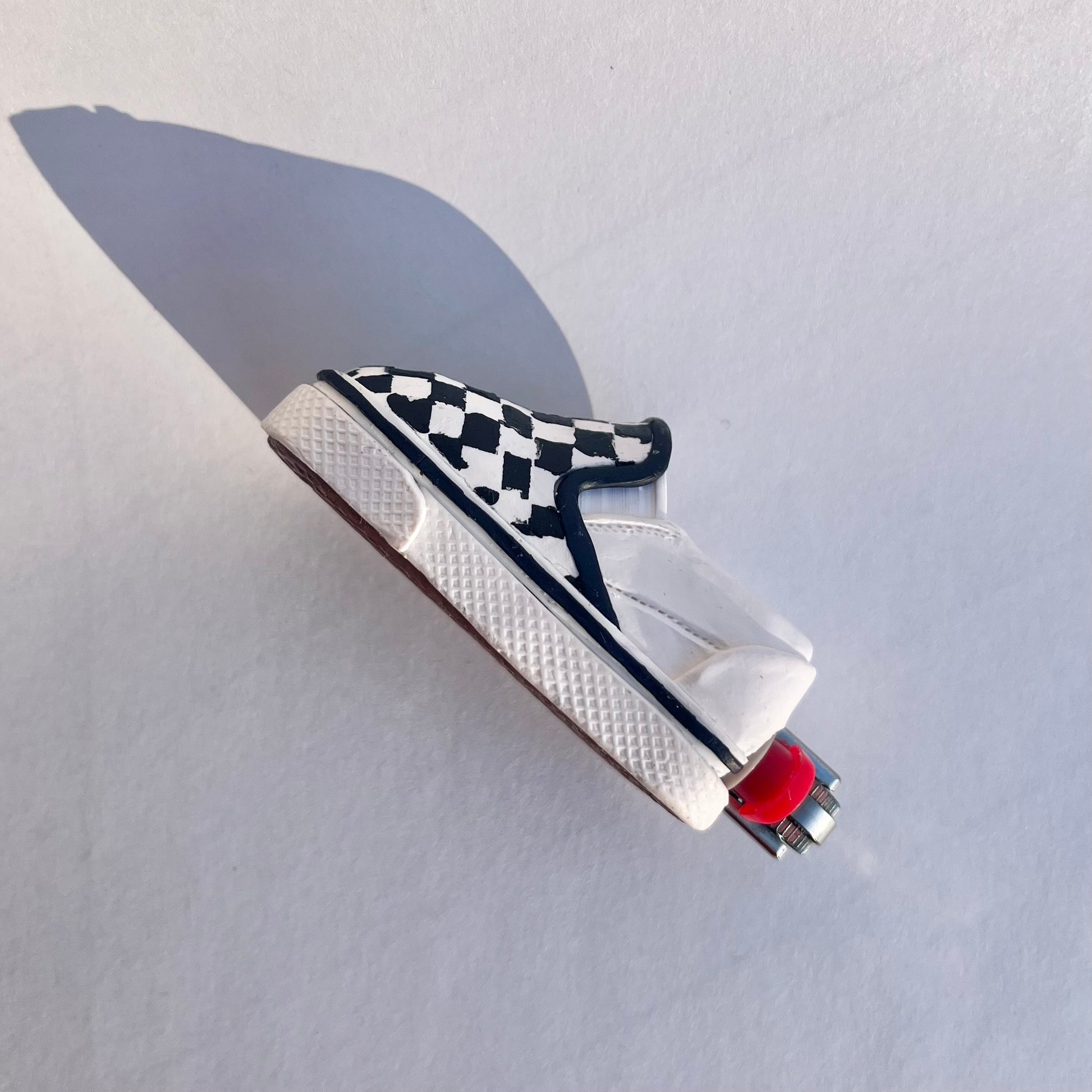 Checkered shoe lighter sleeve, sculpted with polymer clay. Perfect for skaters to slide onto a mini Bic lighter, lighter not included with purchase. Made to be durable, but please handle with care.